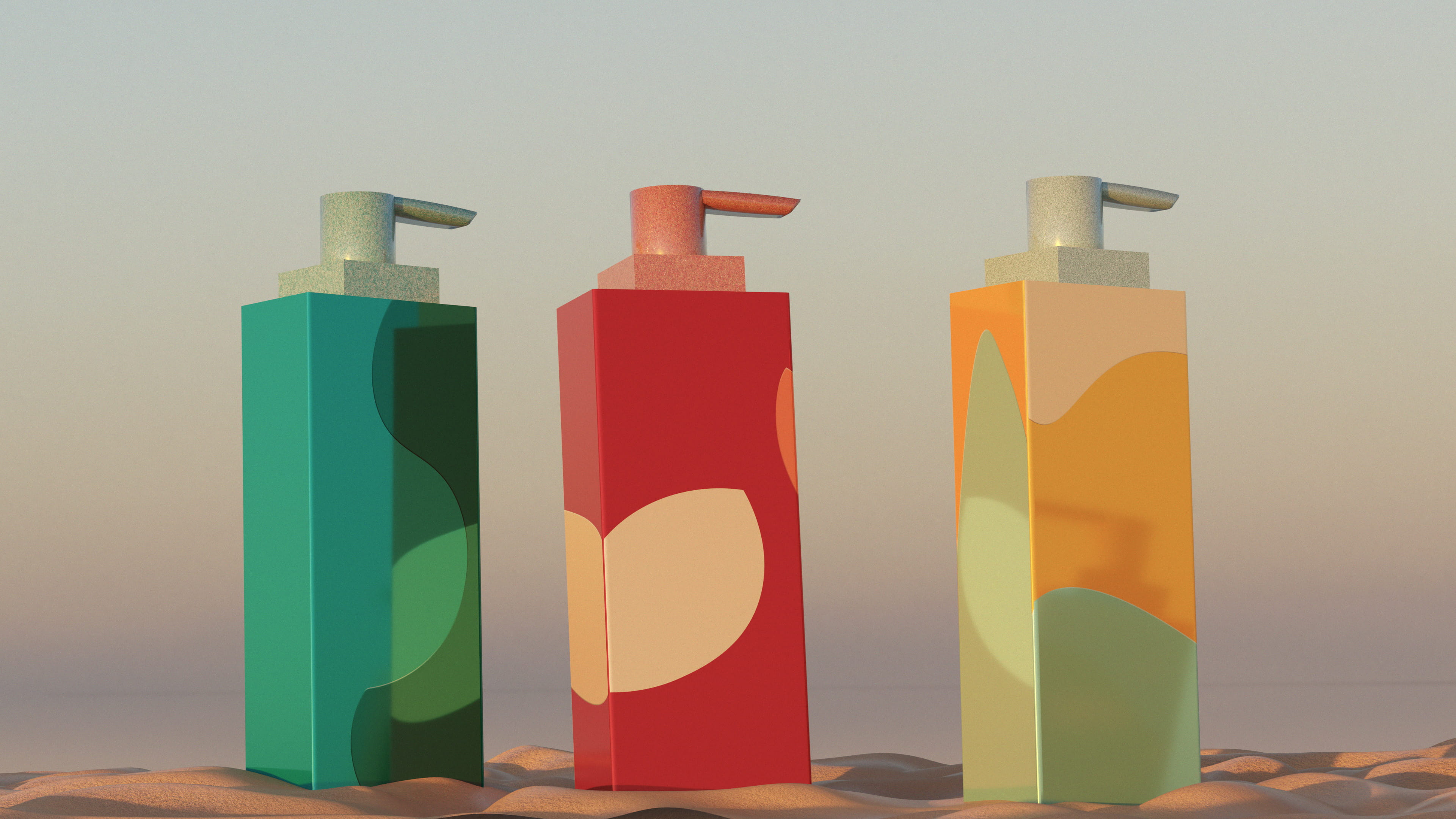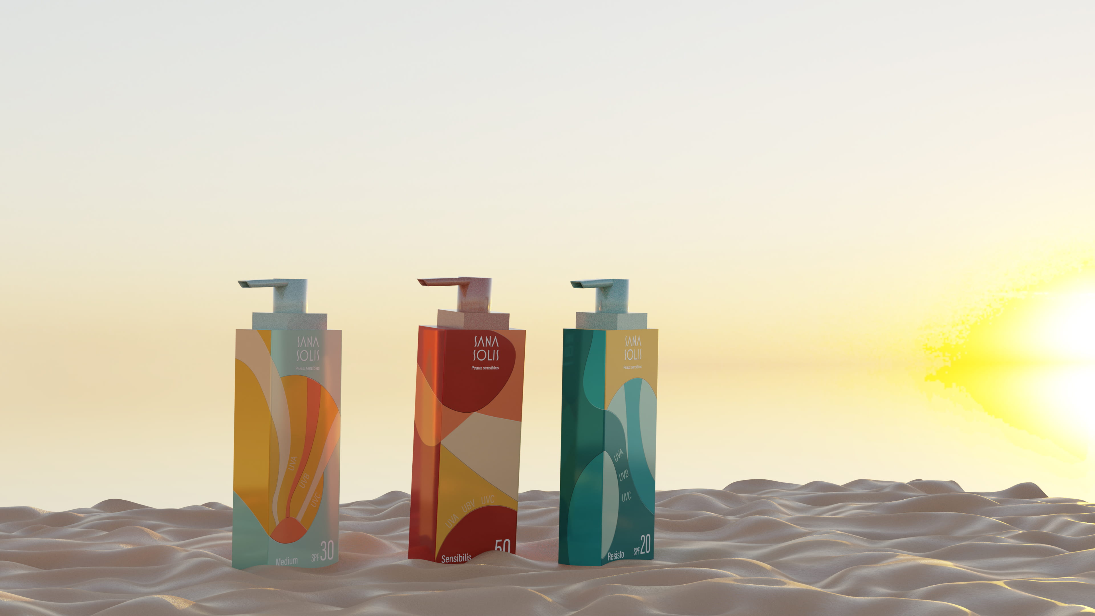 Les packagings que j'ai modélisé en 3D sur Blender, jouent sur volumes et textures et sont fabriqués en vitrimère, un matériau recyclable à l’aspect verre, qualitatif et durable.